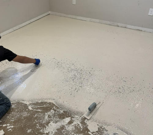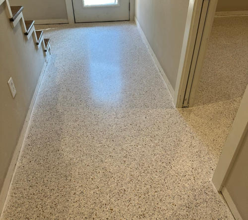 When cracks began appearing in a previously polished concrete floor, our expert terrazzo contractors provided an innovative solution that transformed this townhome's flooring into a stunning work of art. Our team crafted a custom epoxy terrazzo installation that perfectly bridges the aesthetic appeal of polished concrete with the superior durability and consistency that only terrazzo can deliver.Working closely with the homeowners, our terrazzo specialists developed a unique blend that harmoniously complements their existing wood flooring. The custom-mixed epoxy base color serves as a sophisticated foundation, while four carefully selected marble chip varieties create depth and visual interest throughout the surface. This thoughtful combination results in a floor that captures the minimalist appeal of polished concrete while offering the timeless elegance of terrazzo.Our meticulous installation process began with thorough concrete preparation, including precision grinding to ensure optimal adhesion. Understanding the critical nature of moisture control in terrazzo installation, we applied a specialized moisture primer to protect the integrity of the final product. The custom epoxy terrazzo mixture was then expertly installed, followed by a precise grinding and honing process to achieve a refined satin finish that strikes the perfect balance between sophistication and practicality.This project showcases the versatility of terrazzo as a flooring solution, particularly for homeowners seeking to upgrade from polished concrete. The result is a seamless, durable surface that not only resolves the previous cracking issues but elevates the entire space with its custom design and professional execution. Our terrazzo contractors' expertise in both traditional and epoxy terrazzo installations ensures that each project delivers unmatched quality and longevity.